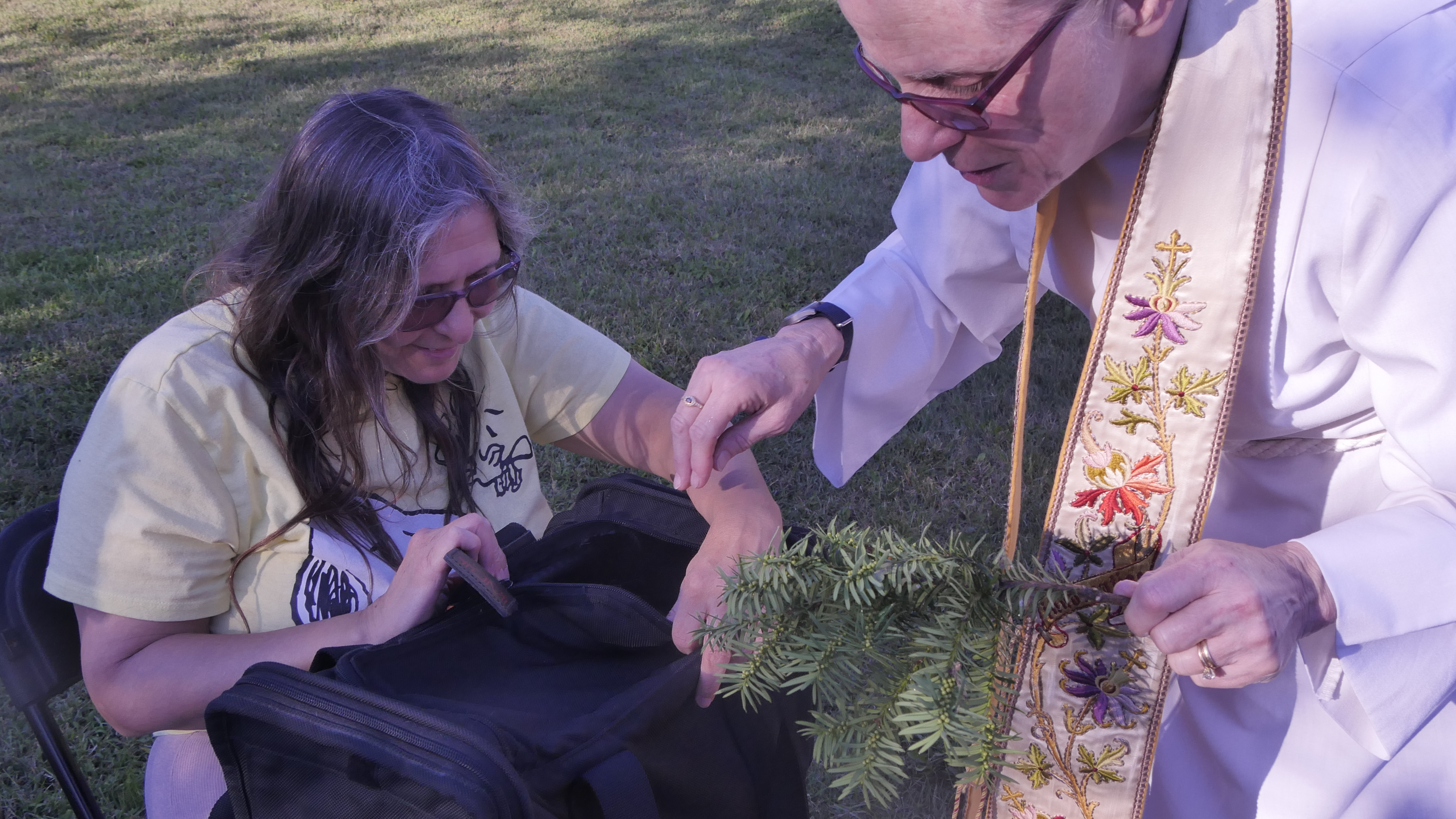 Ingalls told everyone to just remain seated and she and Rev. Victoria Herd would come to each of their animals with a blessing. Ingalls dipped her evergreen branch in holy water and headed for the first row of dogs. They worked their way through the folding chairs around the church yard.