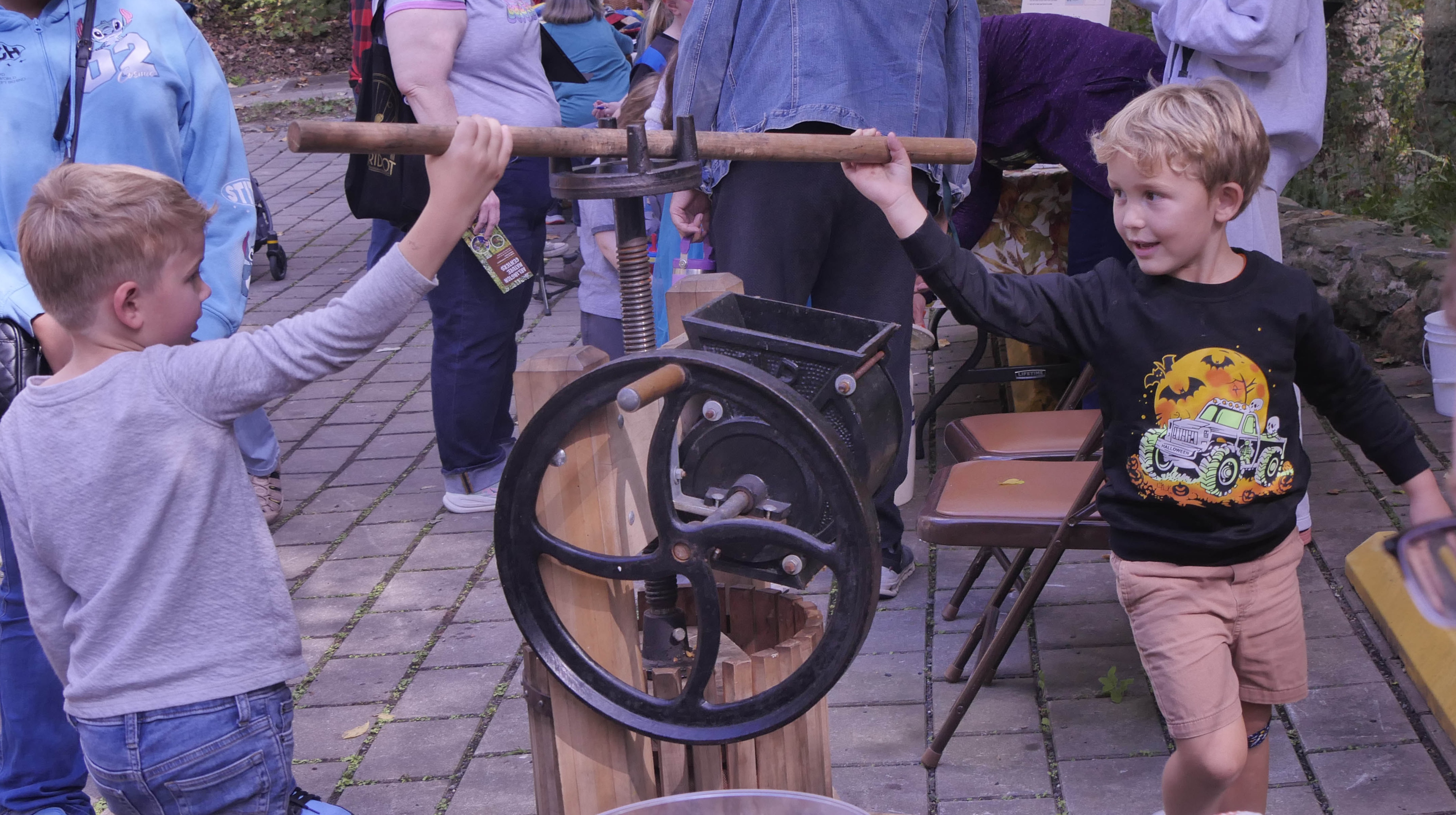 Next door kids are circling round pushing handles that grind chunks of apples into apple cider. A table is loaded with apples from nearby orchards that get cut into chunks and then dropped into the top of the crank. The volunteer explains nothing else is added to the apples for cider; if you add water you end up with apple juice. The table next door is offering tastes of cider either plain or with spices including cinnamon, nutmeg, cloves and allspice.